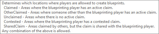| Description | If the option is enabled in the server settings any players on the server cannot create blueprints. Should still be allowed if medieval master is enabled | ||||